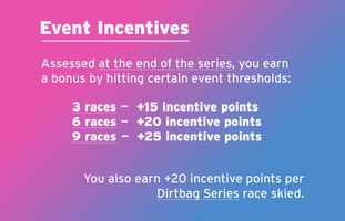 Racers will receive 20 points for participating in any race at a series event, even if it's not the placement race for that event. For example, at the Vasaloppet USA, the 35K skate race will generate placement points up to 100, but a racer could do the 42K and still receive 20 points.